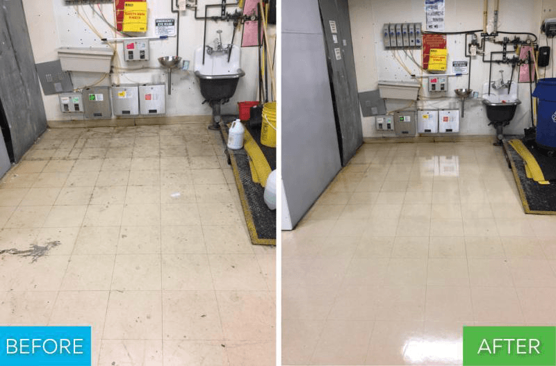 We work on vinyl composition tile (VCT) and other compatible resilient floors that are designed to be finished with floor polish. During the walkthrough we confirm floor type, age, and coating history so we can choose the right stripper, pads, and finish system for your building.