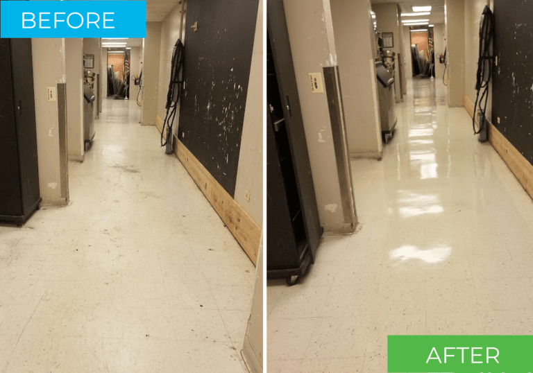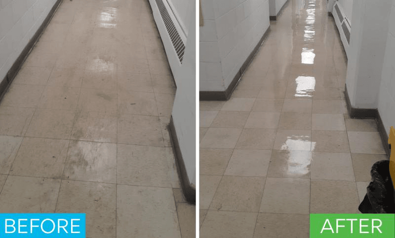 Vinyl floors will need to be recoated after being stripped. That’s why waxing and polishing hard floors will help them shine brighter and last longer. It’s easier to keep polished floors clean because a layer of polish helps keep dirt at bay and acts like a sealant. We recommend this process of stripping and waxing to be performed at least once a year. Buffing vinyl floors will increase the gloss on the wax over time and improve their physical appearance. For commercial business’ buffing services are needed more often than stripping. and waxing.